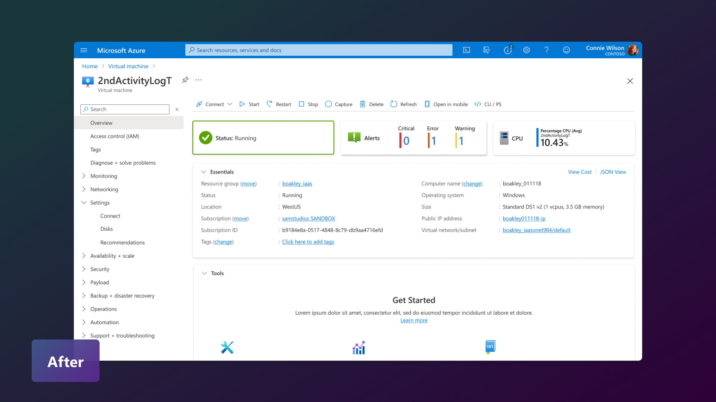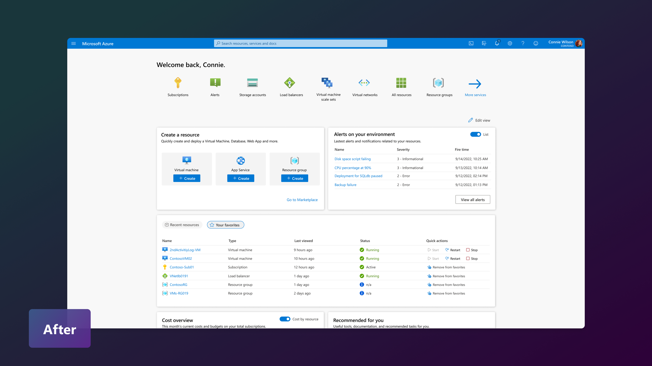 Status and metric-centered Resource Overview: Resource overview pages in Azure are where users manage and configure individual resources such as virtual machines and networks. Today, these pages feel dense and overwhelming, packed with properties, settings, metrics, and add-on features. For neurodivergent users, this cognitive load can slow task completion or lead to task abandonment altogether.