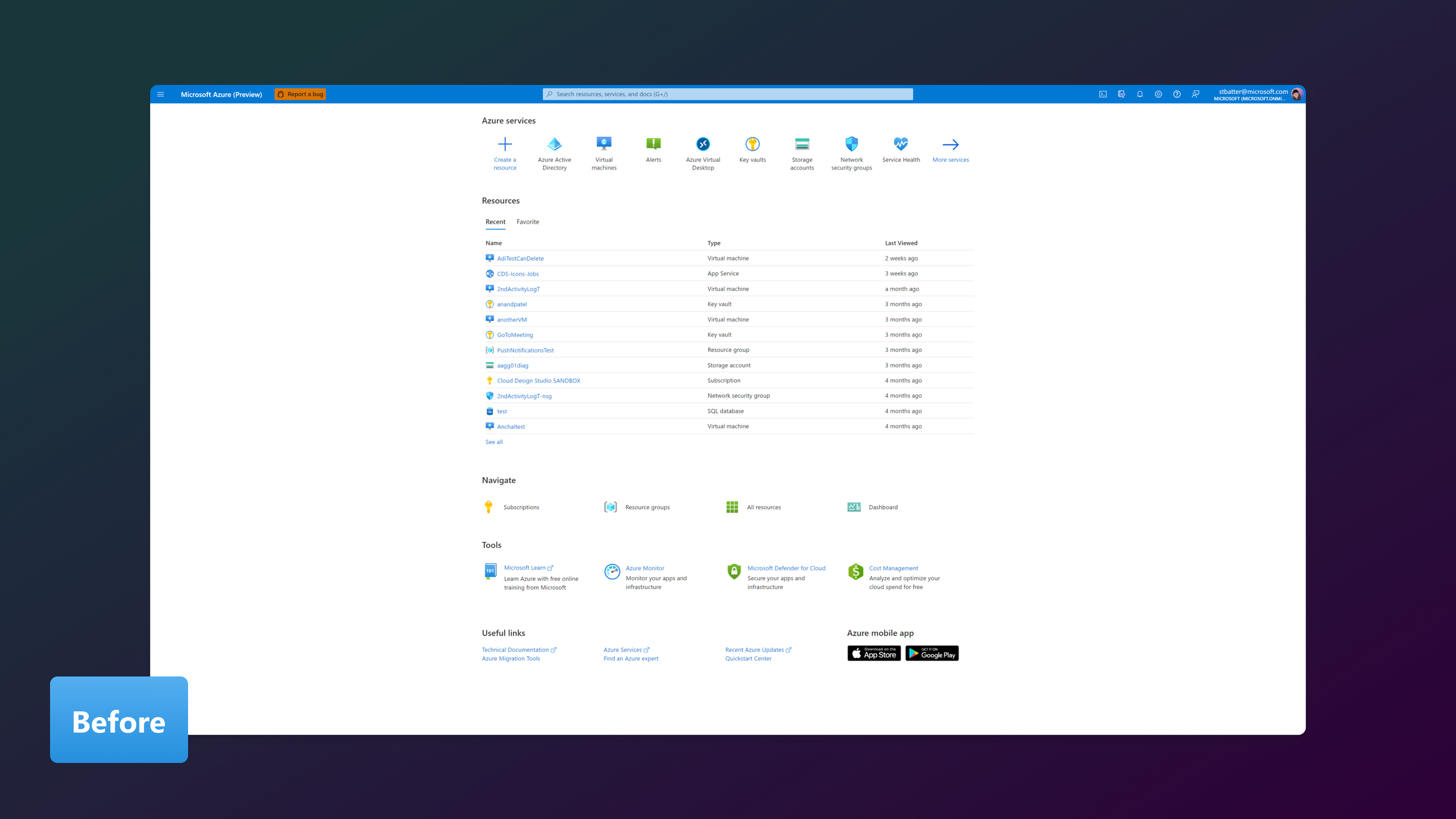 The work was inspired by Marie Kondo’s philosophy of tidying: removing clutter, and creating an experience that sparks joy. Azure’s Home page at the time was densely packed, with redundant sections, low discoverability for important features, and an intimidating enterprise look and feel.