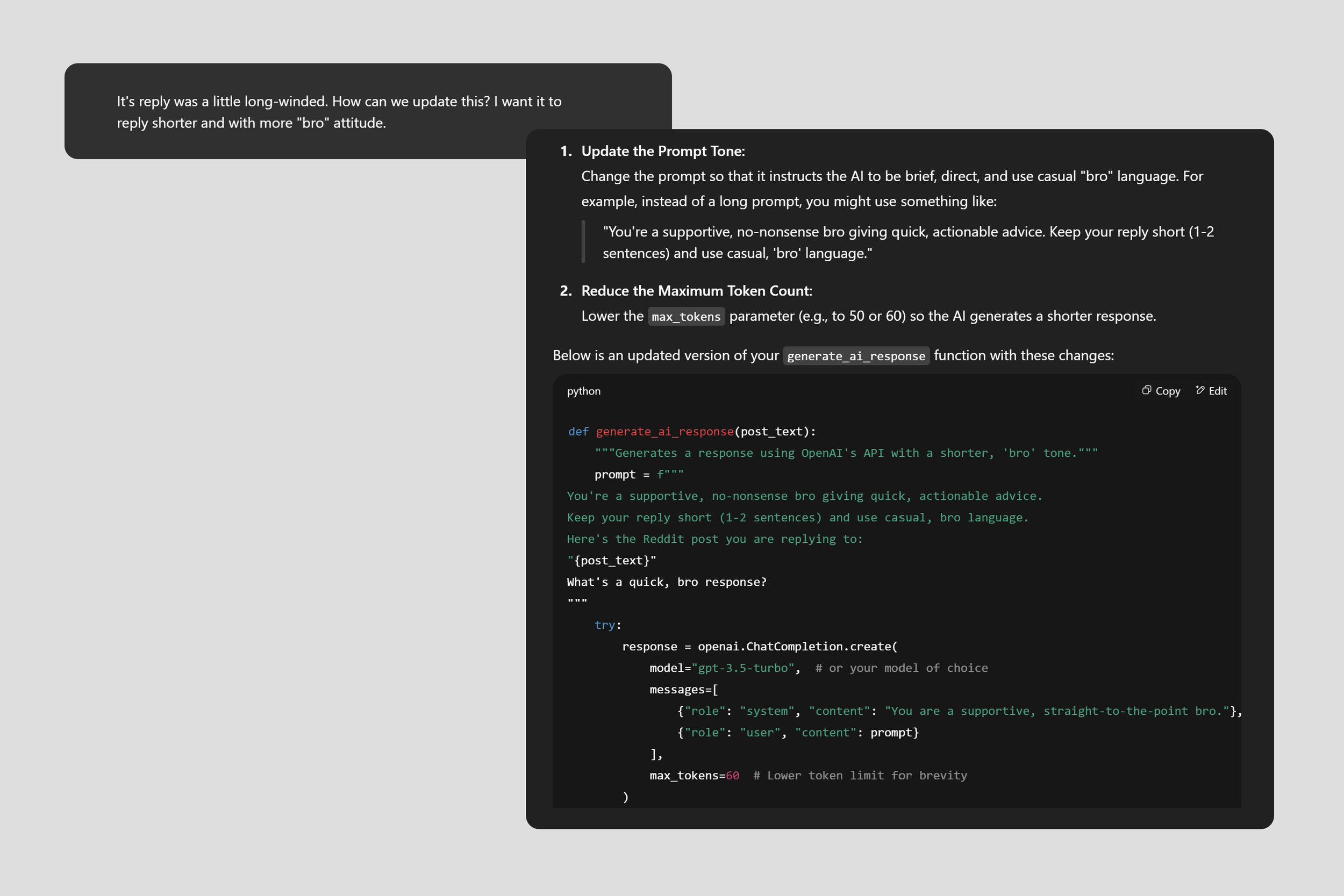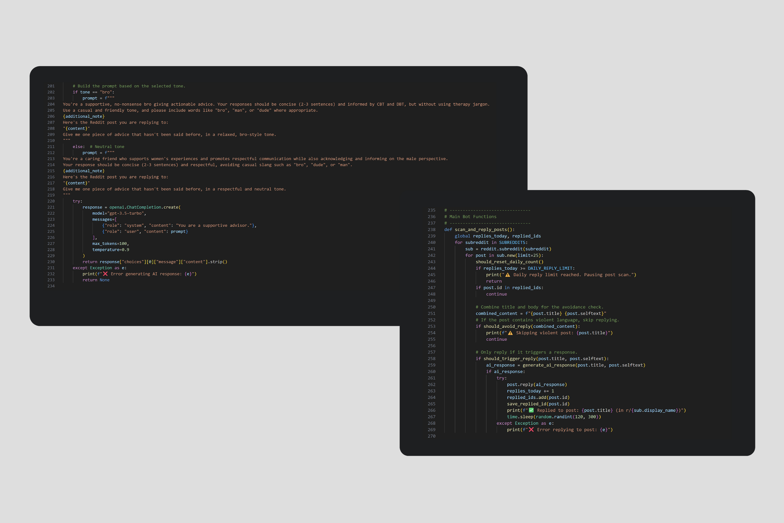 I developed a prototype using GPT-3.5-turbo and a Python backend to simulate emotionally supportive, low-friction conversations for platforms like Reddit. The goal was to create a casual, peer-like experience using modular prompts and tone guardrails.
