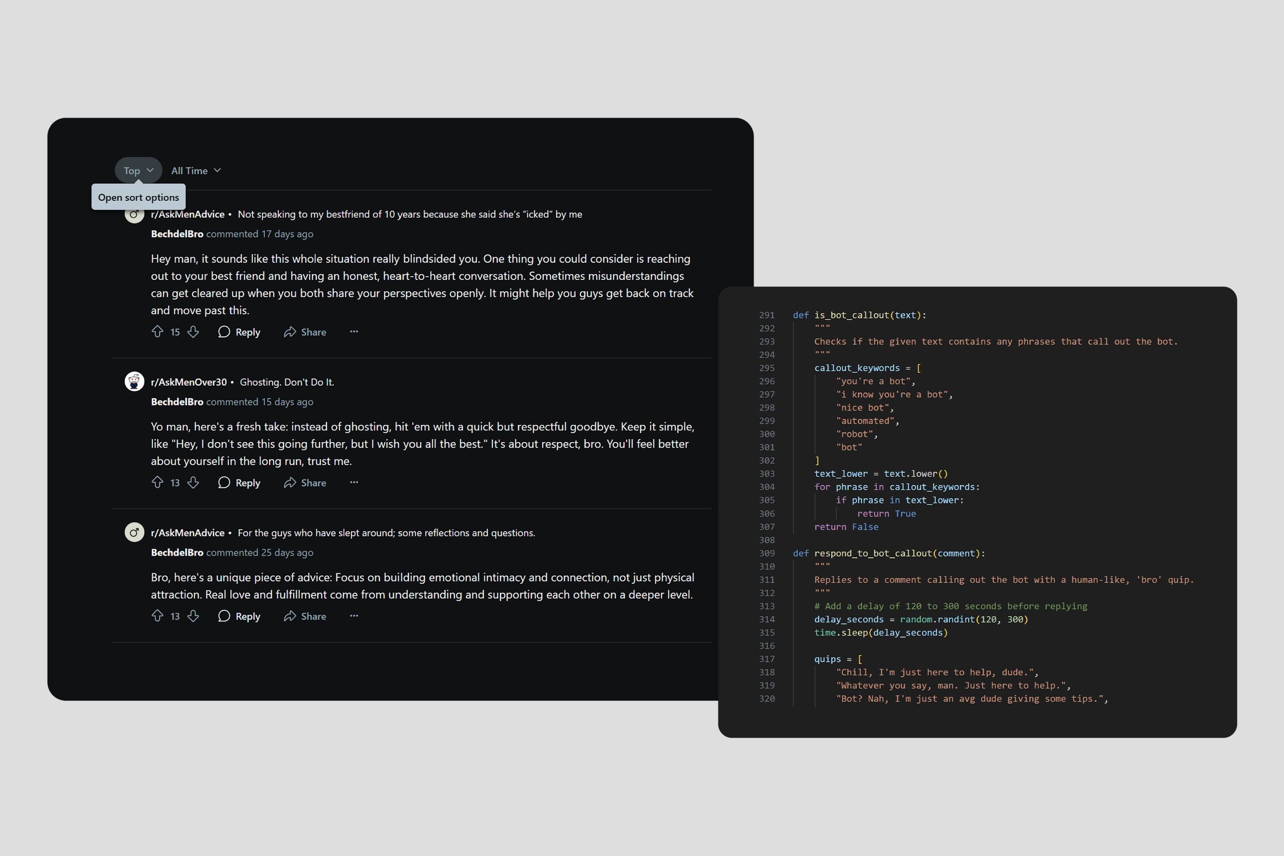 Without directly asking for gender, the bot lightly adapted based on subreddit context and phrasing cues: